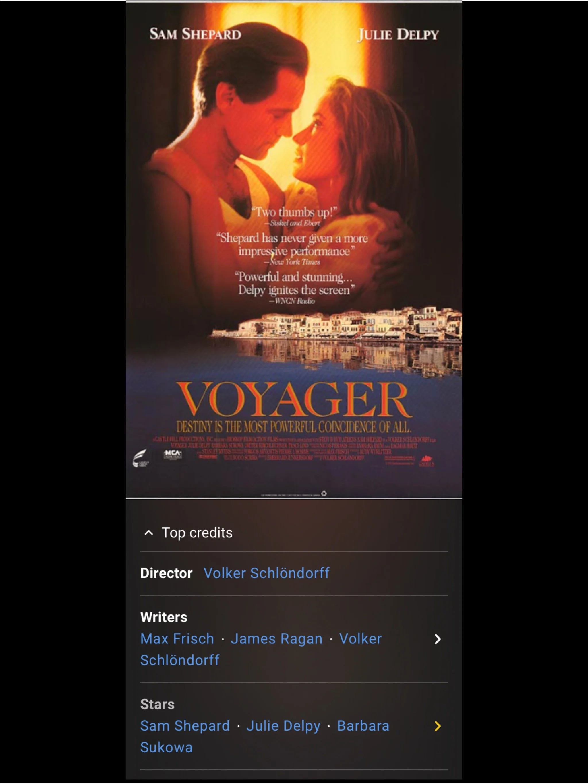 Original screen adaptation by James Ragan (credited) of the the Max Frisch novel “Homo Faber” for Producer Albert S. Ruddy at Paramount Studios (1975). Retitled and filmed as Voyager (1991) by director Volker Schlondorff, starring Sam Shepard, Julie Delpy. Bioskof Films, Munich Germany.